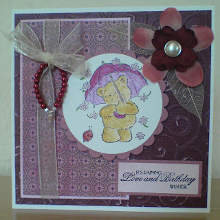 Despite the fact that I had set the challenge, I found it really difficult to decide what I was going to do with all the bits and pieces. The Core'dinations card was embossed with the Cuttlebug 'D'Vine Swirls' folder, then distressed with sandpaper. I layered the flowers and skeleton leaves, then secured them with the brad. My 'something new' is the beaded loop, tied into the ribbon, (with the heart charm linking the two ends) - I've been making beaded jewellery for a while, but I've never used any beads on my cards...not sure why!
