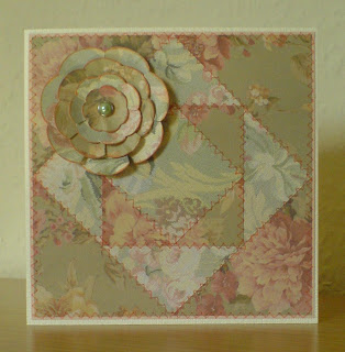 Now, I've taken the theme quite literally...and I will admit to Goggling 'patchwork quilt patterns' whilst deciding what to do this week! lol I found a fairly simple pattern, and cheated a little, by using squares of paper (rather than triangles). I used two pretty floral design papers...which I think may be by K&Co...I'm afraid I don't know the names, as they were pieces sent to me in a swap...which I thought fitted with the 'country cottage' feel of a patchwork quilt. I then added zig-zag faux stitching around all of the edges. As I wanted the quilting to be the main feature of this card, I've added only a simple flower, made from scraps of the same papers cut using some of the 'Blossom' Nesties, cutting down to the centre to make the 'petals', and then I inked around the edges for definition...and as a hangover to last week's challenge, I've attached it with a Papermania pearl brad.