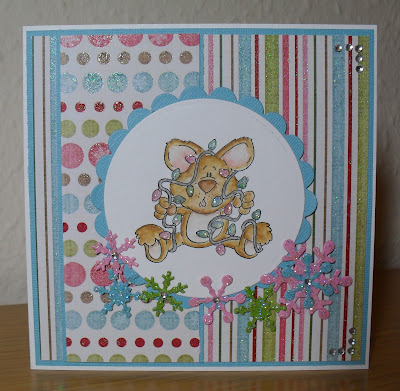 I decided to make a Christmas card...surprise, surprise...and inked up another of my new High Hopes stamps ('Chris Mouse'). I coloured him using watercolour pencils, then added some sparkle to his lights with some 'Ice Crystal' Stickles. The glittery papers are from the 'Wonderful Winter' pad by My Mind's Eye, and the snowflakes were cut using Cuttlebug and Marianne Designs Creatables dies...they've been coated with Stickles too. And I added some adhesive gems to a couple of the corners, and some of the snowflakes for a bit more bling.
