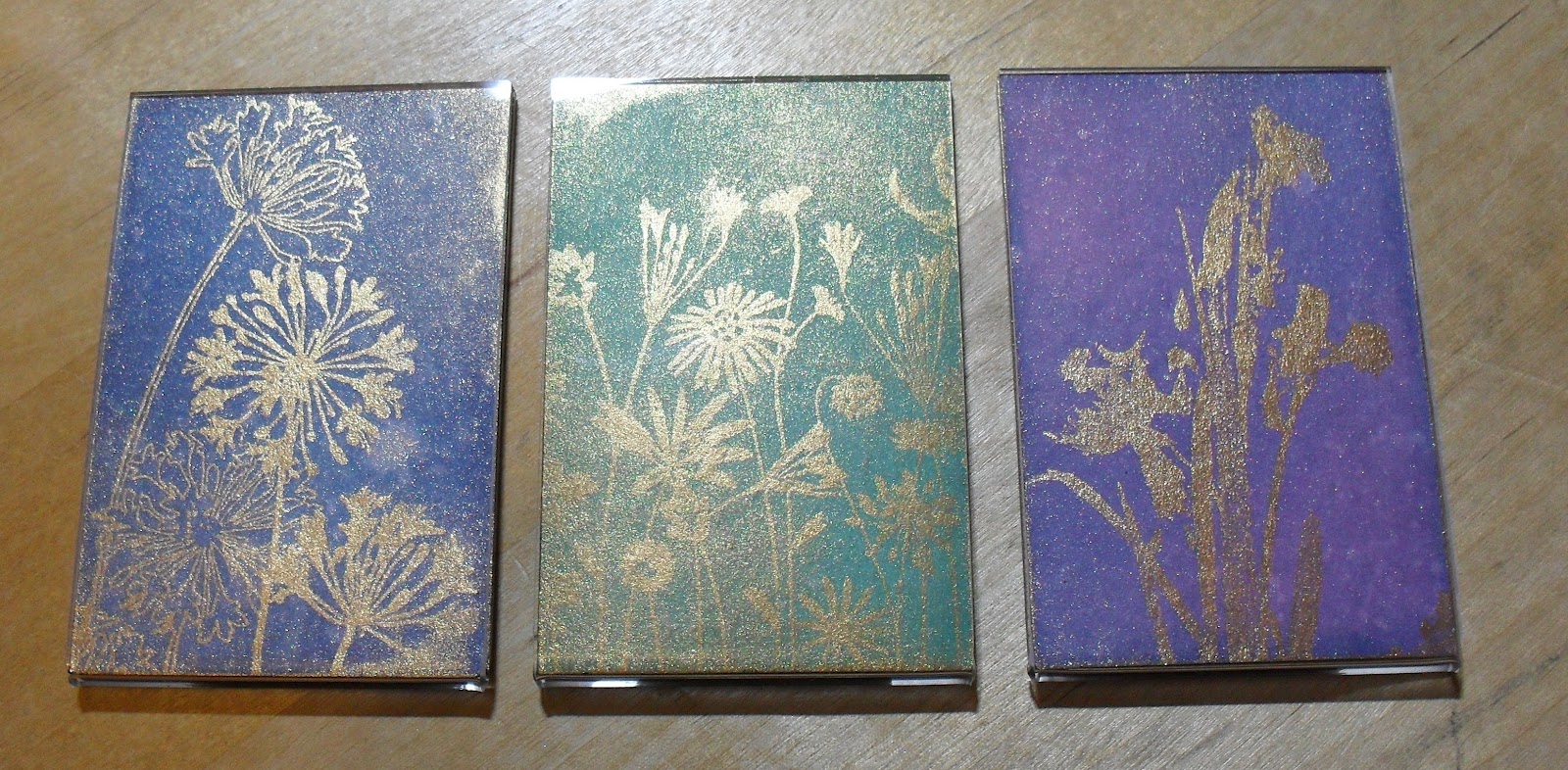 I've decorated some fridge magnets that I bought ages ago from Hobbycraft...they're meant for photos, but I got a little inky instead, and then made them each a little gift tag to use when I wrap them. For the magnets, I cut a piece of plain white card to fit the plastic outer, then inked over each one with a different combination of Distress Inks (Blue: Stormy Sky, Faded Jeans & Chipped Saphire; Green: Tumbled Glass, Evergreen Bough & Pine Needles; Purple: Milled Lavender, Dusty Concord & Chipped Saphire). I stamped a different floral stamp on each one (L-R: 'Agapanthus Clusters' by Stampendous; 'Blooming Meadows' by Hero Arts; and 'Irises' by Penny Black) in Versamark ink, then brushed 'Soft Gold' Cosmic Shimmer mica pigment over the top. For the tags, I used the same technique using a Hero Arts snowflake stamp and a bronze pigment, on just the plain kraft tag.