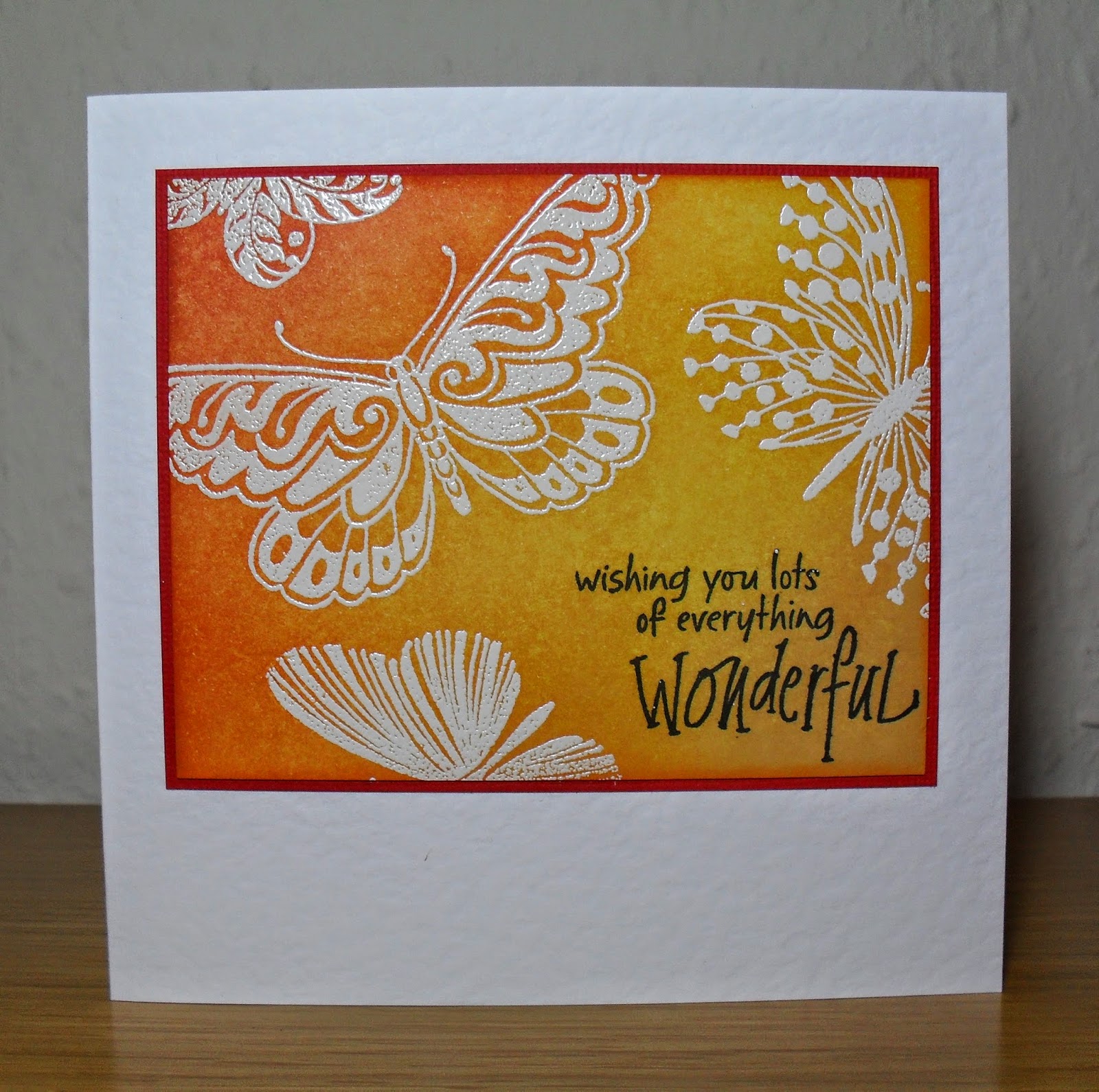 you can see his card here)...it's for my flatmate's Dad...in fact I made him a choice of two, as I was unable to fulfill his request of 'a card with mountains with sheep or goats on'! For this one, I played around with my Distress Inks...blending shades of blue and green (Salty Ocean, Stormy Sky, Faded Jeans, Bundled Sage, Forest Moss & Pine Needles) on to a piece of white card. Then I spritzed some water over it, and stamped my Hero Arts 'Zig Zag' background stamp lightly over the top. I used my star Nesties to cut out a star, then cut the smaller one from that...mounting it inside the larger star aperture on 3D foam pads. The sentiment stamp is from the Hero Arts 'Sentiments' set, and I doodled the borders using a black gel pen.