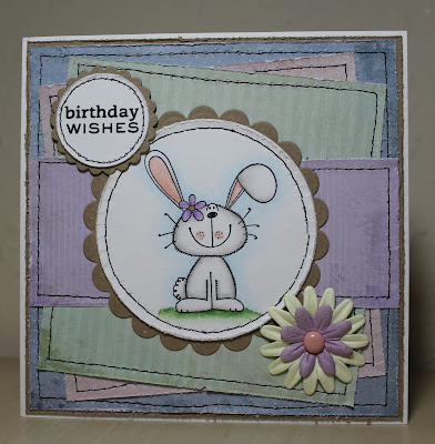 I made a card for each of the two themes...on my 'C' card I featured a cute Hedgie & Robin as my creatures ('Wishes for Kisses' by Penny Black). I coloured the image using watercolour pencils, then simply added some faux stitching along the top and bottom using my CutterBee Bug and a black gel pen. I added a snippet of patterned paper (from the 'Special Delivery' pad by Helz Cuppleditch) behind the image and a sentiment from a set by Lili of the Valley.