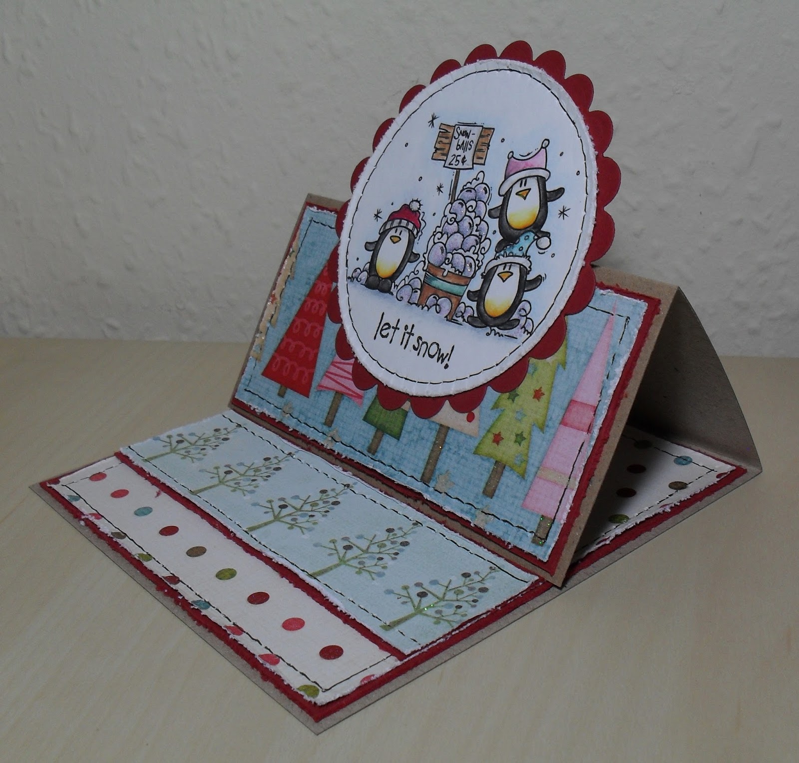 For the 'M is for More than One' theme, I picked a Penny Black stamp called 'Carolers'...featuring 'more than one' caroling chickens! Again, I used watercolour pencils to colour the image...this time adding a sentiment from the 'Caroling Chicks' set by Stamping Bella. I also used 'more than one' paper (all from the 'Christmas Cheer' pad by Lily Bee Design), once again adding a little distressing and some faux stitching.