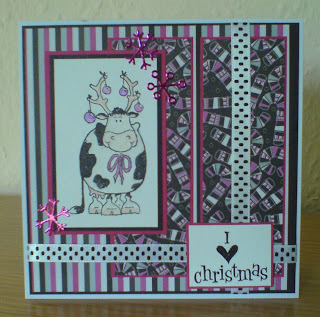I've used the sketch from this week's Penny Black Saturday Challenge, and a rather non-traditional colour combo of Black, White & Pink. The image is 'Bedecked Antlers', and the papers are by DCWV (from thee 'Rose Tinted Christmas' stack). The sentiment stamp is also by Penny Black, the ribbon is from Poppicrafts, and the snowflakes were cut from pink mirror card using one of the Cuttlebug 'Winter' dies.