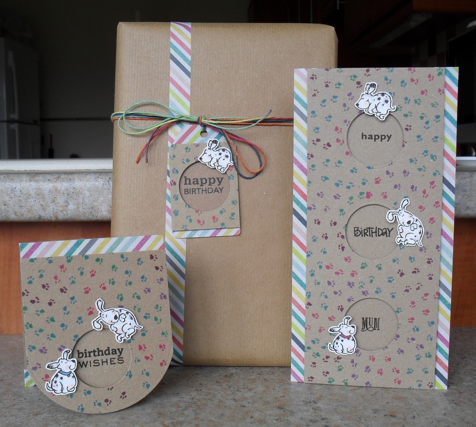 I made a matching set using some cute little puppy stamps from the Penny Black 'Man's Best Friend' set. I coloured them all using watercolour pencils, then fussy cut them all out. I decided to use kraft card for the card base, and stamped panels of card with the little paw print stamp that comes in the set in various colours of Distress Inks (Picked Raspberry, Wilted Violet, Seedless Preserves, Mermaid Lagoon, Peacock Feathers, Lucky Clover). I edged the card and tag bases with some stripey washi tape (from Freckled Fawn), then stamped sentiments from various sets (Paula Pascual 'Big Messages', Simon Says Stamp 'Sending Sunshine' and Clearly Besotted 'You & I'). I cut circular apertures in the paw print panels, so that the sentiments would peek through, then mounted them on 3D foam. Then I added the little pups leaping around all of the apertures.
