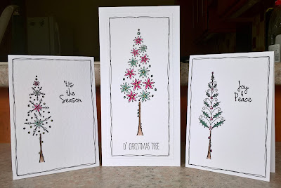 The new to me technique that I tried was 'Inlaid Die Cuts', so I pulled out my Tim Holtz 'Detailed Butterflies' dies and some Distress Inks, and gave it a go. I started by painting some Distress Inks on to wet watercolour paper...I did four different colourways, each using three similar shades of ink in a random pattern, letting the inks blend together. Once they'd dried, I cut a butterfly from each one, and then a matching one from plain white card. I cut 'solid' butterflies from more plain white card, and added the detailed outlines on top before using the coloured pieces to carefully 'fill in' the holes of the white butterflies. Having spent quite a lot of time assembling my butterflies, I kept the cards really simple, cutting a piece of white card slightly smaller than my card base, stamping a sentiment (from the 'Doddled Flowers' set by Happy Little Stampers), and piercing some holes around the edge using my CutterBee Bug, before adding the butterflies using 3D foam pads.