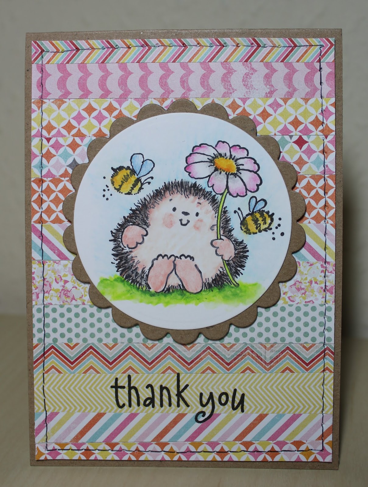 I used lots of the thinnest snippets to make a background, sticking them on to a large-ish snippet of plain white card, then trimming down the panel to fir an A6 tent fold card blank. I stamped my Penny Black hedgie (called 'Buzz in the Air') on to a snippet of white card, then coloured him using watercolour pencils, and cut him out using one of my Nesties. I added some faux stitching around the edge of the snippets panel using my CutterBee Bug and a black gel pen, and stamped a sentiment (from the 'Anytime Messages' set by Hero Arts) along the bottom.