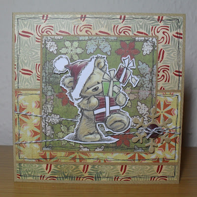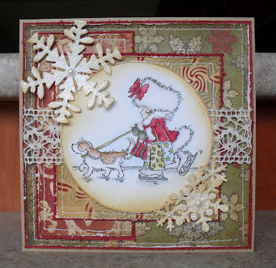 I'm back with a Christmas card this morning...for a few challenges: the sketch is from Christmas Stampin' All Year Long; I followed the Simon Says Stamp Challenge 'Recipe' of '3 embellishments, 2 papers and 1 image'; and the 'Animals' theme of the Creative Inspirations Challenge. The image is from the 'Holly-Jolly' set by Penny Black...I watercoloured it, then added some glitter to the baubles, and replaced the star on the top of the tree with a brad. The sentiment stamp is also by Penny Black...I masked off the heart before stamping and embossing, then added the heart-shaped brad in it's place (both brads are from Tesco). My third embellishment is the gold ribbon (wrapped around the middle strip, behind the sentiment). My two papers are actually both sides of a double-sided Cosmo Cricket paper (from the 'Be Good' range)...I hope that counts...and I used my 'Snowflakes' folder to emboss the plainer side.