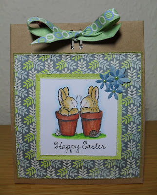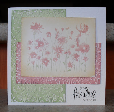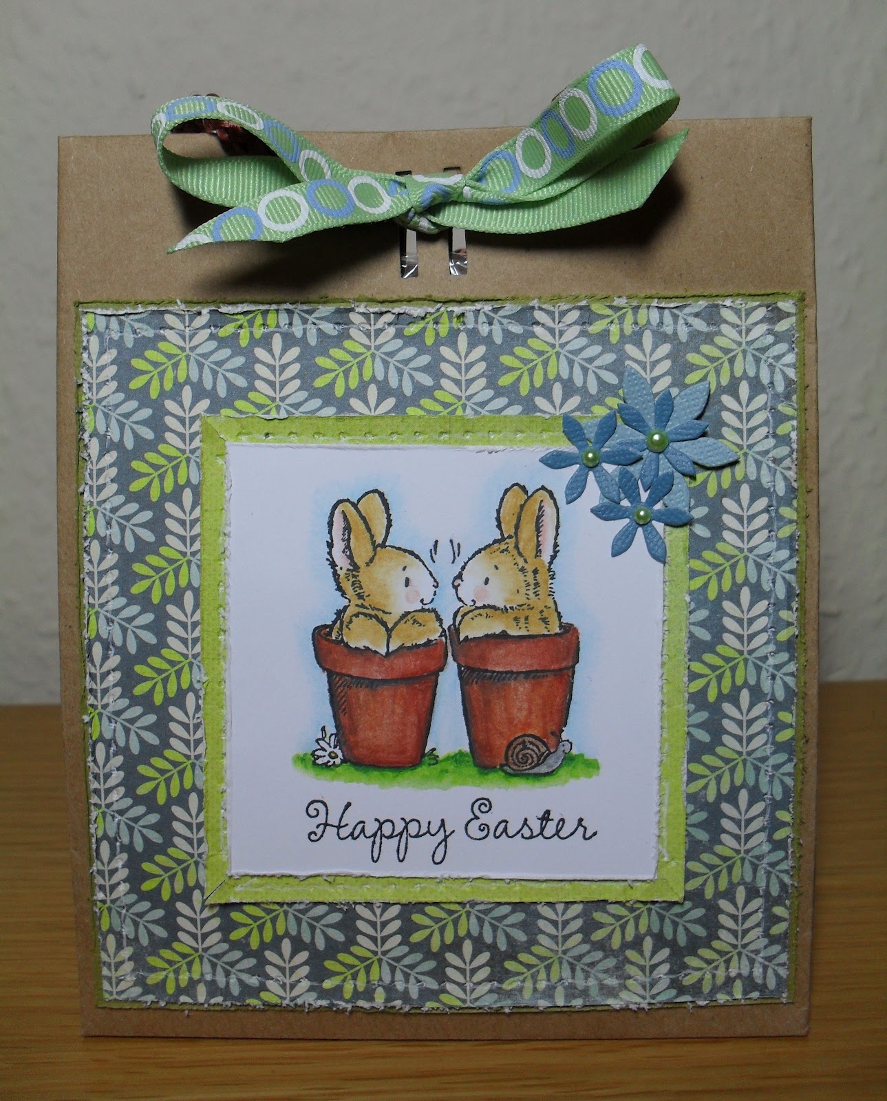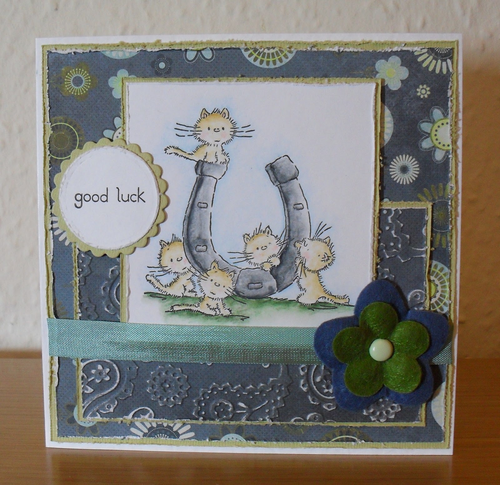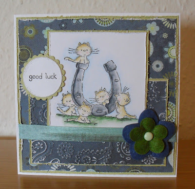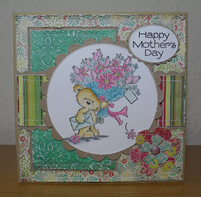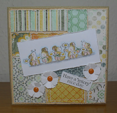 These started life as 12x12 papers, but now there's nothing left that's bigger than about 5 inches, and most bits are much smaller...so I did what I often do when I ponly have little pieces left, which is to make a sort of patchwork effect backing - great for using uneven sized scraps. I distressed the edges, and added faux stitching using my CutterBee Bug and a white gel pen. The image is from the 'Micey Day' set by Penny Black, coloured using watercolour pencils...the sentiment is also from the same set. I made the 'daisies' using my Tim Holtz 'Tattered Florals' die and BasicGrey brads for the centres.