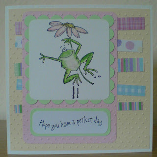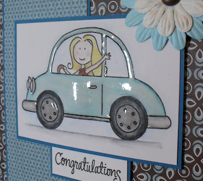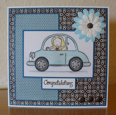 The 'hot wheels' in my case are on a car (I was sent this image in a swap...and I think it's by Elzybels)...and I've made a car for a new driver. The papers are from the 'Offbeat' pad by BasicGrey (available here at the Secret Crafter), the flowers are from Poppicrafts, and the sentiment stamp is from the 'Sending Sunshine' set by Simon Says Stamp.