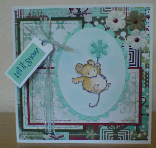 When I saw the brad, I just knew I had to use this stamp (Penny Black 'Xmouse Ornament!'), so I masked off the snowflake part of the stamp and replaced it with the brad. I've decoupaged the little mouse, although you can't see that very well in the photo. The kit was great fun to use - thank you Pauline! The only thing I added (apart from my stamped images) was a couple more flowers (as I had some of the same style, and I thought the one little flower looked a bit lonely!) and a bit of faux-stitching around the layers of paper.