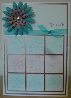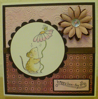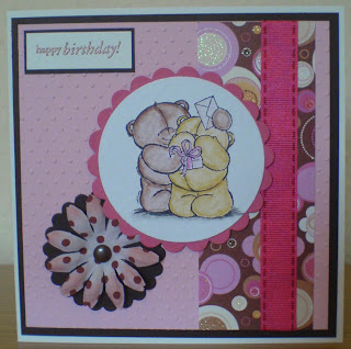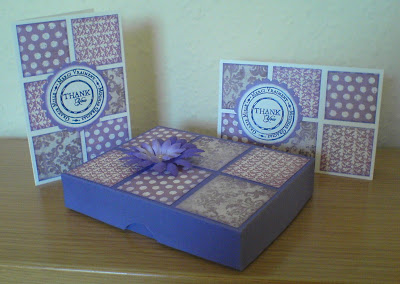 I've made a set of 12 'Thank you' cards with a matching box, to give as a Christmas present. I created a patchwork design on the cards using squares of three co-ordinating My Mind's Eye papers (from the '29th Street Market' collection), inking the edges with a 'Wisteria' coloured chalk inkpad. The sentiment stamp is from the 'Talking in Circles' set by Autumn Leaves, and has been embossed in pearl violet to match the papers. I made the matching box using my Top Score Multiboard, with a couple of Flora Doodles flowers held in place with a Papermania pearl brad.