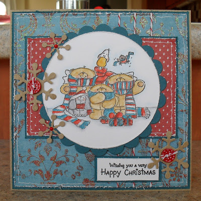 I've used a 'Forever Friends' image this time, with paper from the 'Glitter' stack by DCWV, a pink and brown spotty 'Flora Doodle', ribbon from a set from the £shop, my 'Swiss Dots' embossing folder and the same sentiment stamp as my first card.