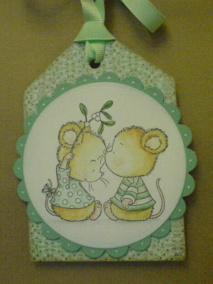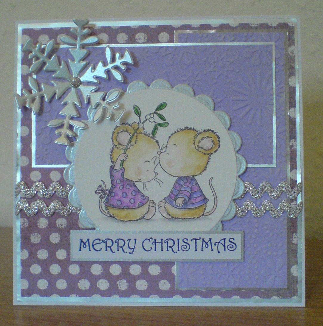 I've used a sweet Stampavie stamp called 'Mistletoe and Mice' by Gillian Roberts. I coloured the image using watercolour pencils and paired it with some papers from the 'Bundled Up' pad by Crate Paper (the snowflake ones) and from the 'Yours Truly' pad by Pebbles Inc (the hearts & spotty ones). I distressed the edges of the papers, then added some faux stitching using my CutterBee Bug and a black gel pen. The sentiment stamp is from a Lili of the Valley set.
