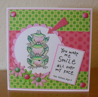 So, now on to my card. I've used another of the new Rachelle Anne Miller designs 'Hoppy Spring' (by Stampavie), and a fab sentiment form the 'Kid's Quotes' set by Inkadinkado. The paper is by K&Co (from the Amy Butler pad), my ribbon, and the three flowers are from Poppicrafts. The five plain round brads are by Papermania, and the sparkly butterfly brad is by Dovecraft.