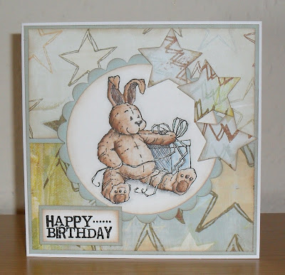 Having got all my DT stuff done for next week...I've had time to play along with some other challenges this morning. I've used the sketch from Sketch & Stash...although I used a circle rather than an oval, as it suited my image ('Monster Sax' by Hambo stamps) better...which although I've had it for a couple of months...this is the first time I've used it. The papers are by My Mind's Eye ('29th Street Market'), and I used my Cuttlebug 'Moroccan Screen' folder to emboss the green strip, before distressing the edges with inks and my distressing tool. The sentiment stamp is by Inkadinkado, and the ribbon is from Poppicrafts.