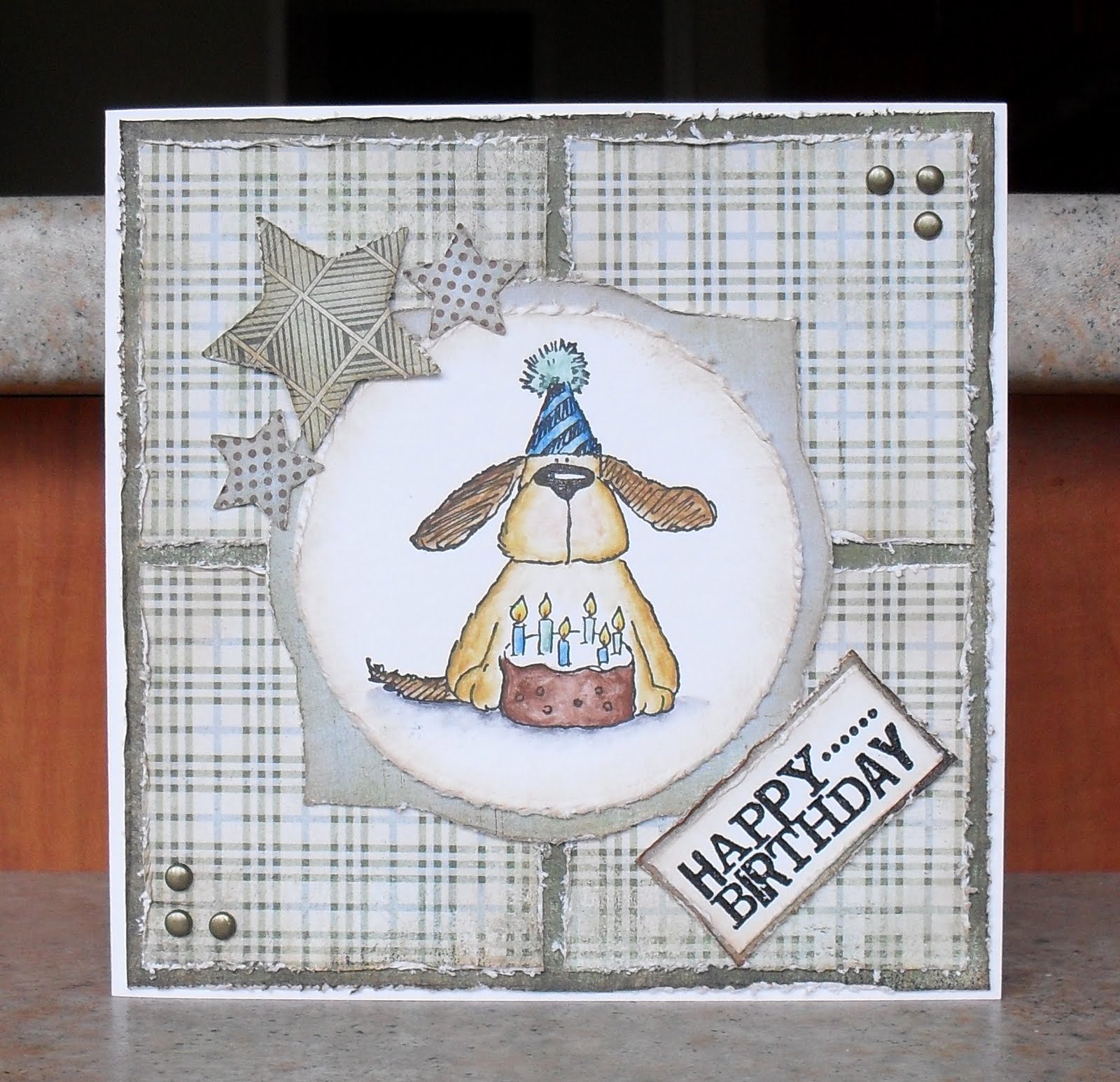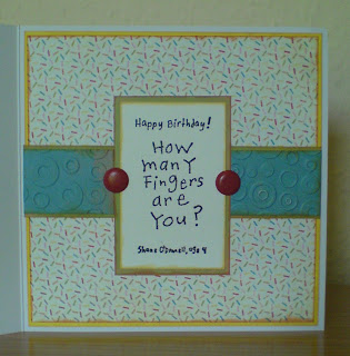 I've followed the sketch from the Sketch & Stash Challenge for this card...and have managed to include the themes of a few other challenges too...Cupcake Craft asked us to use numbers on our cards (they are on the paper); the Daring Cardmakers wanted 'Farmyard Animals' so I've given them a chicken; and the Penny Black Saturday Challenge was to use at least three different shapes...and I've managed to get squares, rectangles, triangles and a star on this card. My main image is 'Party Perch' by Penny Black...which I've had for ages, but can't remember the last time I inked it up, and my new item is the sentiment stamp (from the 'Kids Quotes' set by Inkadinkado). The papers are all from the 'Cupcakes' pad by BasicGrey, and the star was cut using a Nestie die.6 brads