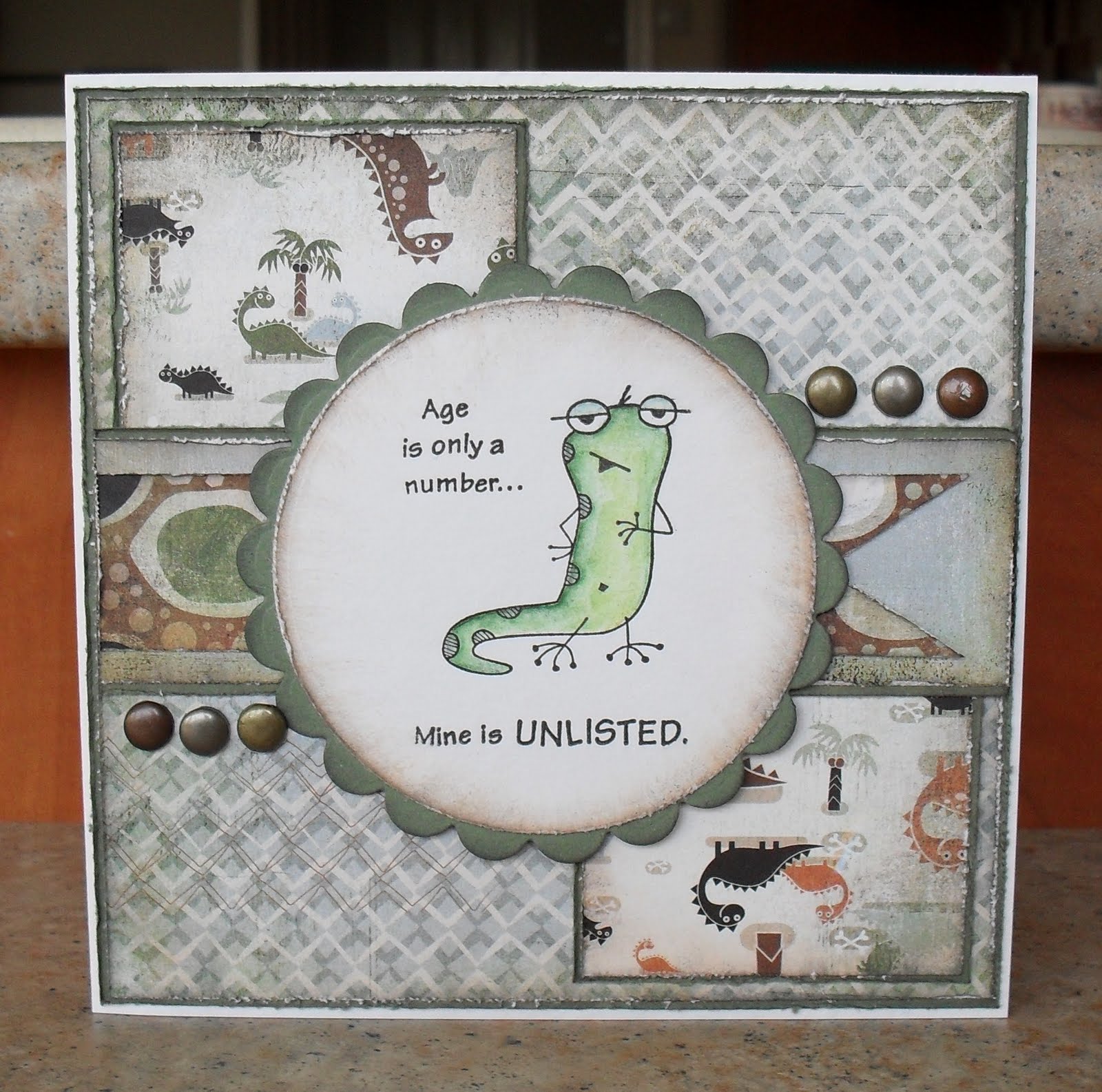 There's a fab sketch for this week's Mojo Monday Challenge...where it's contest time...so I just had to have a go. I've combined it with the themes from some other challenges: A Spoon Full of Sugar's 'One for the boys'; Cards for Men's 'Humour'; Crafty Calendar's 'April Fools'; and Creative Inspirations (Wed) 'Green, Brown & Blue' (although the colours all look a bit grey in the photo! lol). The image is 'Unlisted' by Inkadinkado, and the papers are from the 'Archaic' pad by BasicGrey...I thought that the dinosaurs kind of looked like the lizard! lol