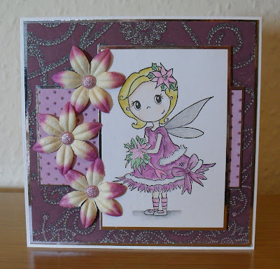 For my card, I;ve used one of the Wild Rose Studio Fairies, that Emma stocks, called 'Ella with Flowers', which I coloured using watercolour pencils, and then used a Sakura Stardust pen to add some shimmer to her wings. The papers are from the 'Penny Lane' glitter pad by My Mind's Eye, and I matted them on to some silver mirror card. The flowers are from Kort & Godt, and the sparkly silver brads in their centres are by American Crafts.