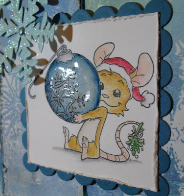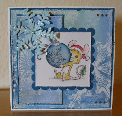 Whilst looking through my stash for inspiration...I discovered I had several suitable stamps and images...but I just couldn't resist Henry (by Whiff of Joy). I coloured him with watercolour pencils, then added Glossy Accents to the ornament. The paper is by Sandylion - my Mum found it along with some others, and a few rubber stamps in a charity shop last week...thanks Mum! I distressed the edges, and added some faux stitching, and a few adhesive gems. The large snowflake was cut using my Cuttlebug 'Ice Crystal' die, then coated with glamour dust.