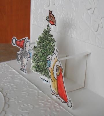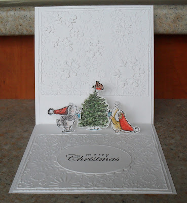 I continued with the snowflake theme inside, with more embossing, and snowflakes cut using Marianne Creatables and Cuttlebug dies. The images I've used are from three clear stamp sets by Penny Black: 'Christmas Critters'; 'Jolly Friends'; and 'Holly-Jolly'. The sentiment stamp is by Paper Make-up.