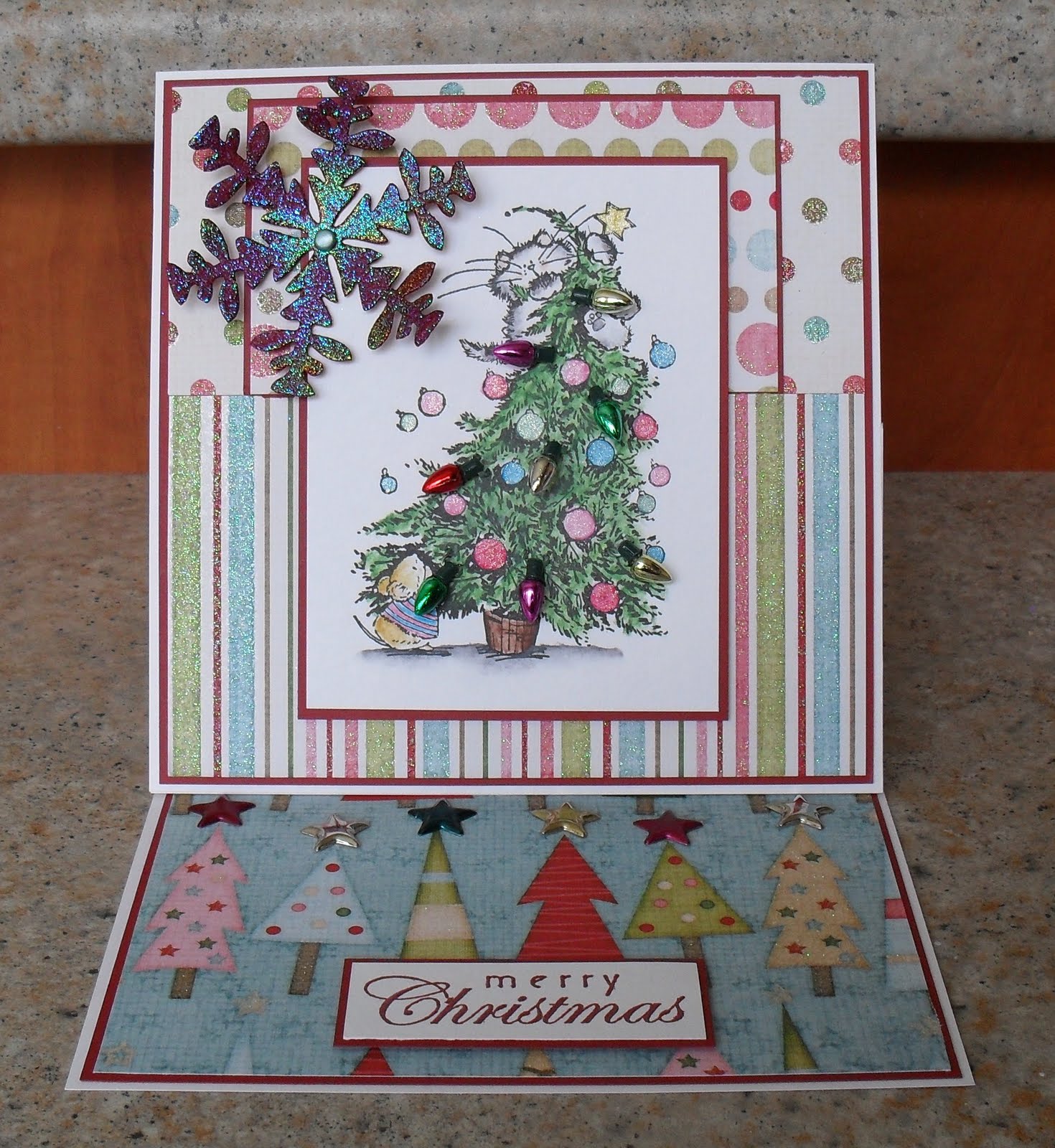Well, as I was unable to find an image with any Christmas lights on...I decided to 'adapt' one of my Christmas tree images (this one is from the 'Holly Jolly' set by Penny Black) with some cute little lights. They came on a string, but I cut them up and poked the string through holes I made on the image, then fixed them in place with tape on the back. Here's a close up: