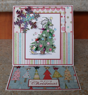 The sparkly papers are from the 'Wonderful Winter' pad by My Mind's Eye, the snowflake was cut using my Cuttlebug  'Ice Crystal' die, which I then stamped with Versamark ink, and coated with holographic embossing powder. I added some star shaped bards (from Tescos) to the tops of the trees on the bottom section of the card to hold my easel part up, and the sentiment stamp is by Paper Makeup.