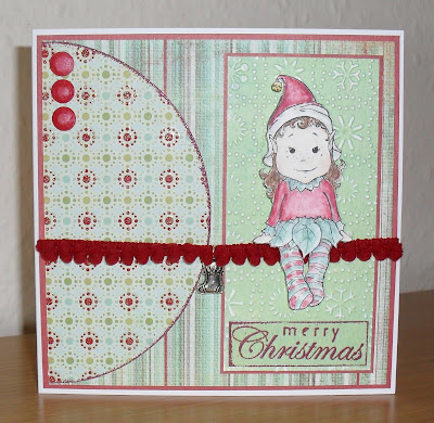 For my card, I've used an elf image by Magnolia (kindly sent to me by my ABC Challenge DT buddy Vicky), which I've watercoloured, and then cut out. I've perched her on some fabulous red pom-pom trim, sent to me by my lovely new DT buddy Lacey...who is also sponsoring this challenge...and has donated a fabby WOJ Gnome stamp from her Stamp & Create Store as a prize for the lucky winner. The papers are all My Mind's Eye - the striped and plain ones, are from the '29th Street Market' collection, and the spotty one is from the 'Wonderful Winter' pad. I used my Cuttlebug 'Snowflakes' folder for the embossing, lightly sanding the surface to reveal the white core. The sentiment stamp is by Paper MakeUp, and the cute little stocking charm is also form Lacey.