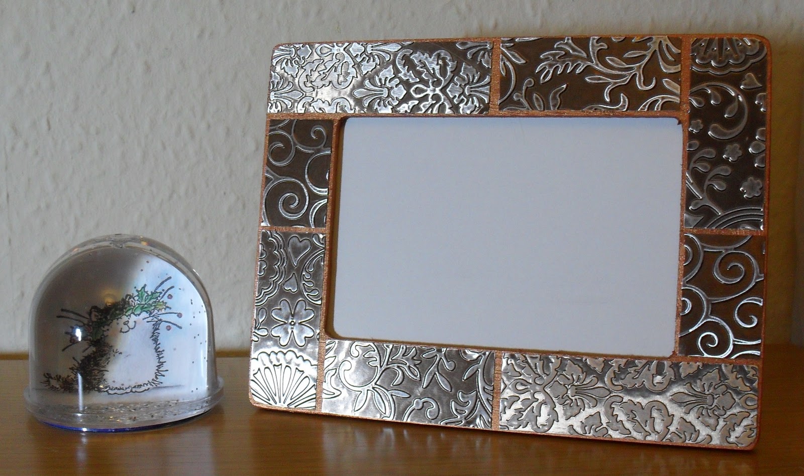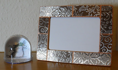 I also bought the photo frame in Hobbycraft (sorry...I forgot to take a photo of it 'naked')...and I painted it with bronze paint, then added pieces of bronze metal, embossed with various Cuttlebug folders ('Floral Fatasy', 'Victoria' & 'Kassie's Brocade'):