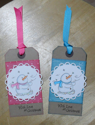 For my final project...I've used a cute little snowman digi image from our lovely sponsor the Stamp Fairy to make a couple of little gift tags for when I wrap these presents. I coloured the wee chap with watercolour pencils, and added some 'Crystal' Stickles to the snow. The blank tags are from WHSmiths, and the sentiment is a Lili of the Valley stamp: