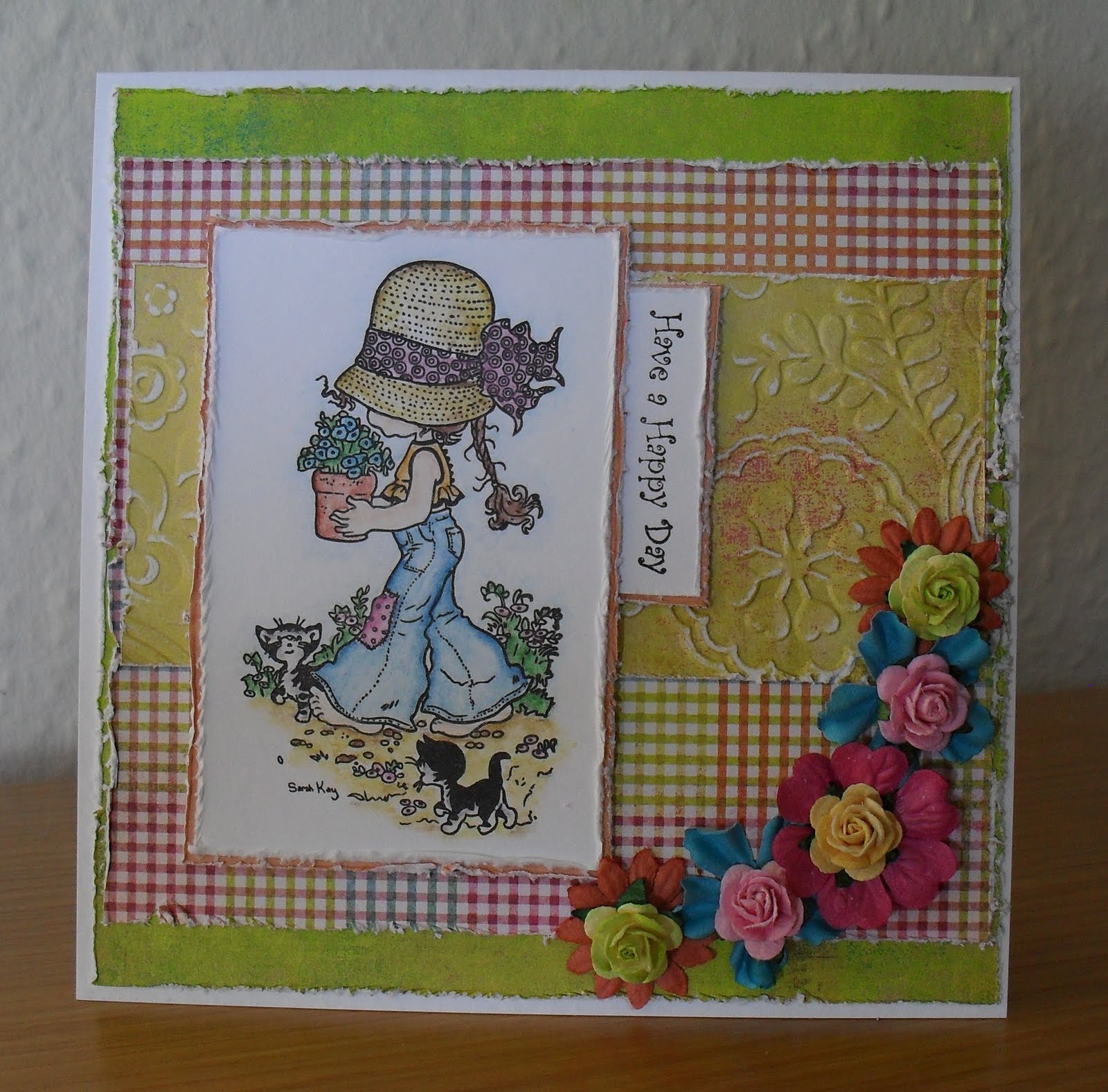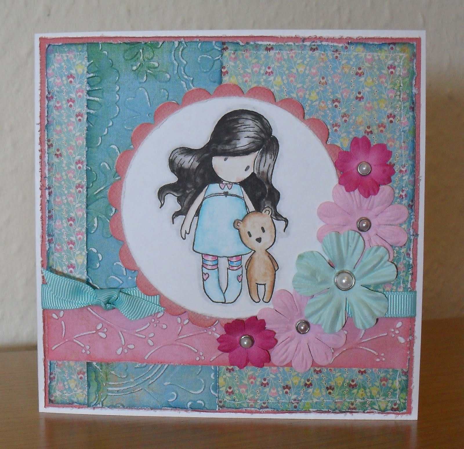 I've used one of the Gorjuss Girl stamps by Sugar Nellie on my card...and rather appropriately, it's called 'Teddy Bear'. The papers are from the 'Lemonade' pad by BasicGrey, the flowers are a mixture of Poppicrafts, Prima and Petaloo, and the pearl brads are by Papermania. I used my 'Stylized Flowers' and 'Just My Type' Cuttlebug folders to emboss the 'plain' papers, and then sanded the raised areas to reveal the white core.