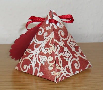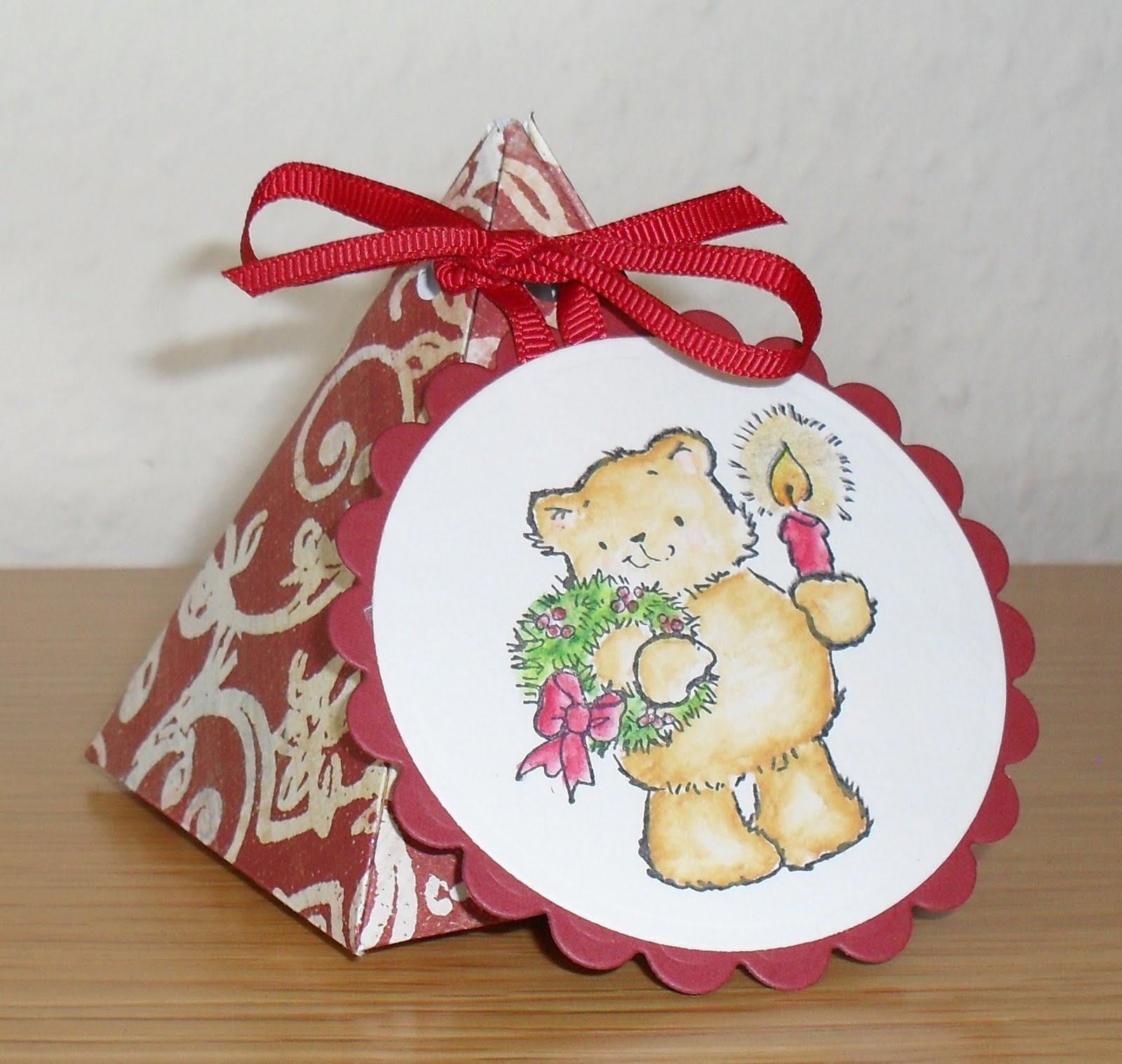 In the end, I decided to make a little Christmas gift box...it's a pryamid shape...and just perfect for hanging on the Christmas tree. I used this freebie template from Pink Petticoat, printed on to the reverse of a piece of paper from the My Mind's Eye 'Signature Christmas - Festive' collection. After cutting out the template, I punched a hole in each of the 'points', and threaded some ribbon through to close the box. For my tag, I've used a cute little Penny Black bear called 'Candle-lit Night', which I've watercoloured, then cut out with my Nesties.