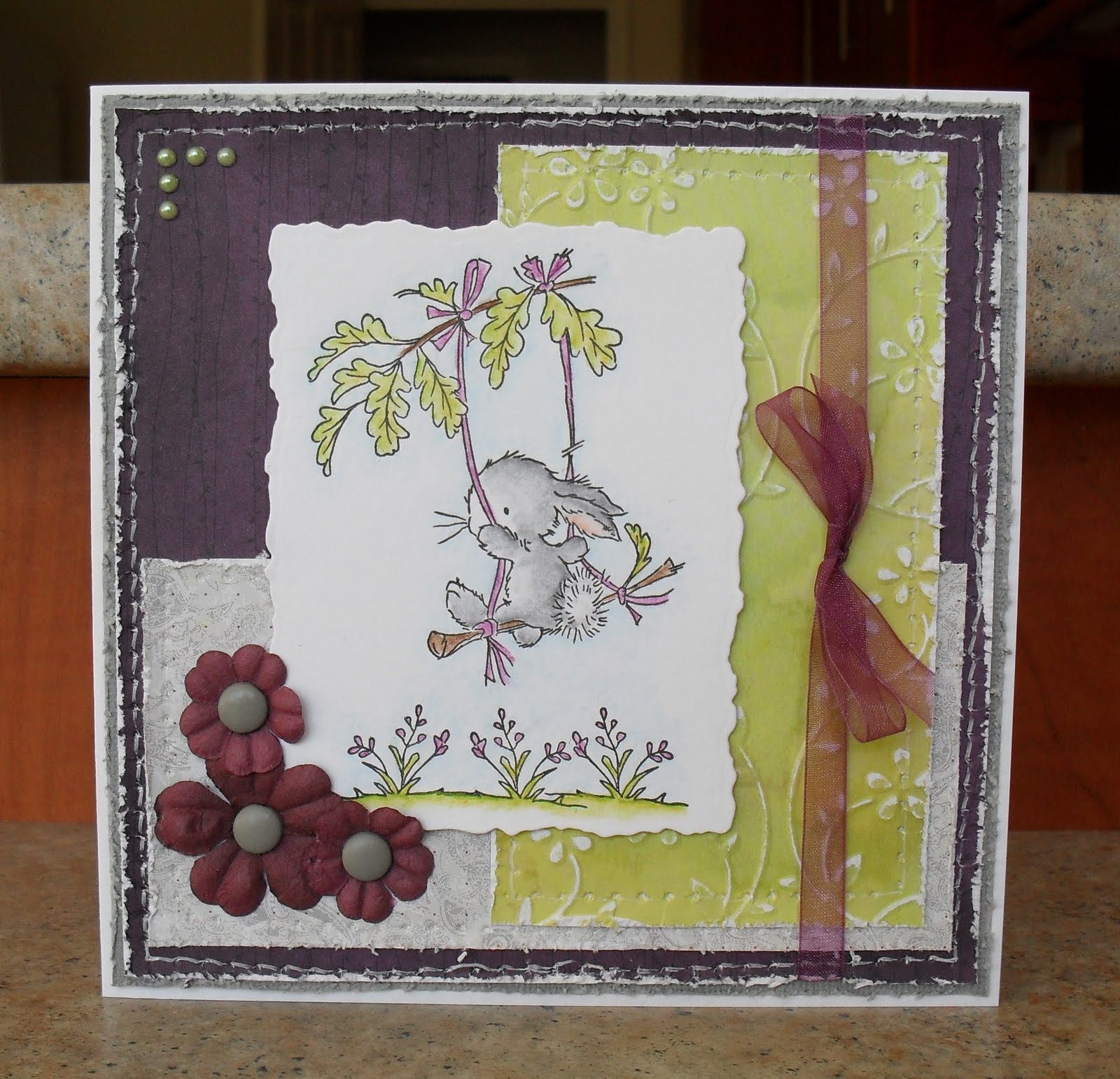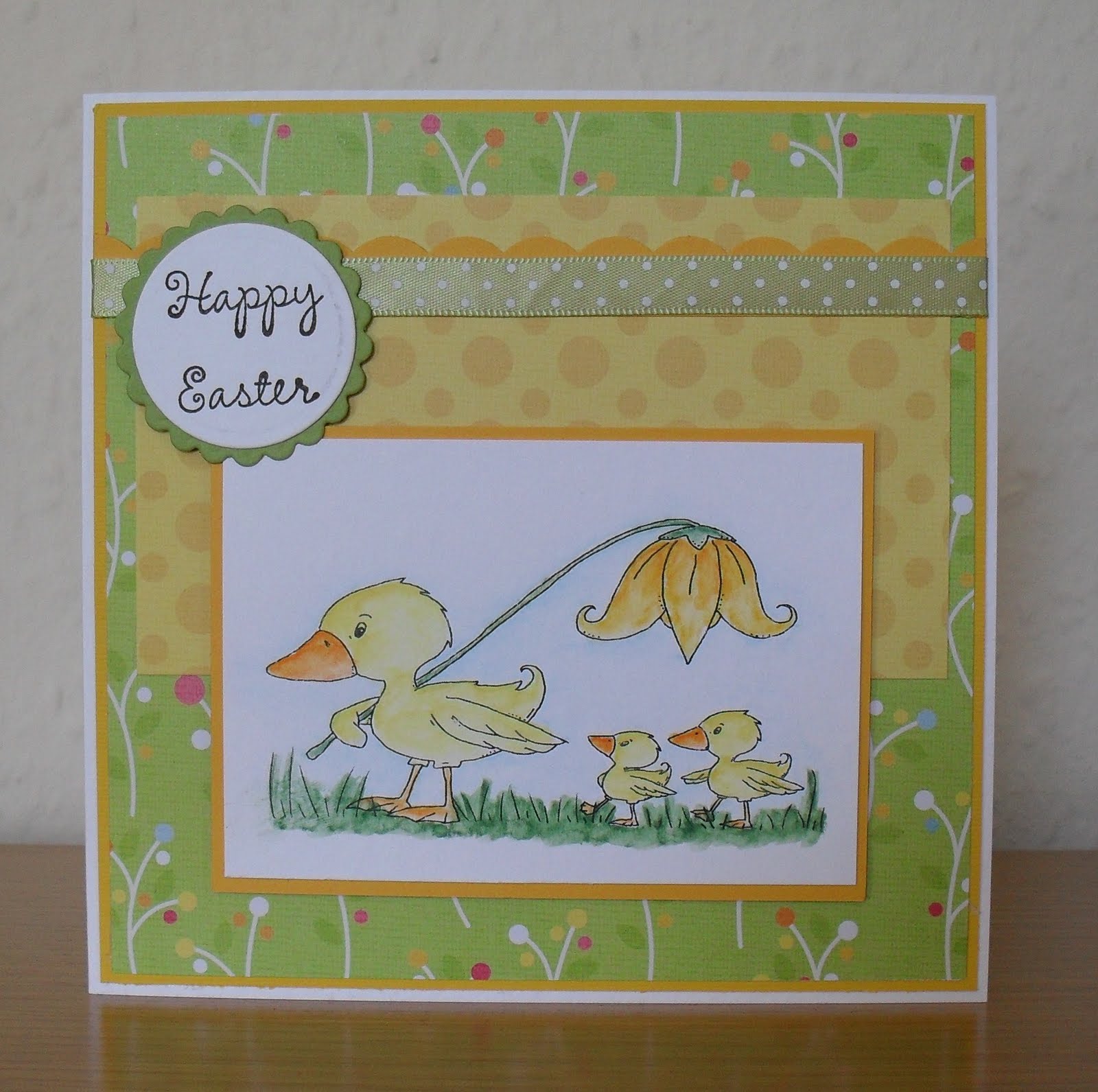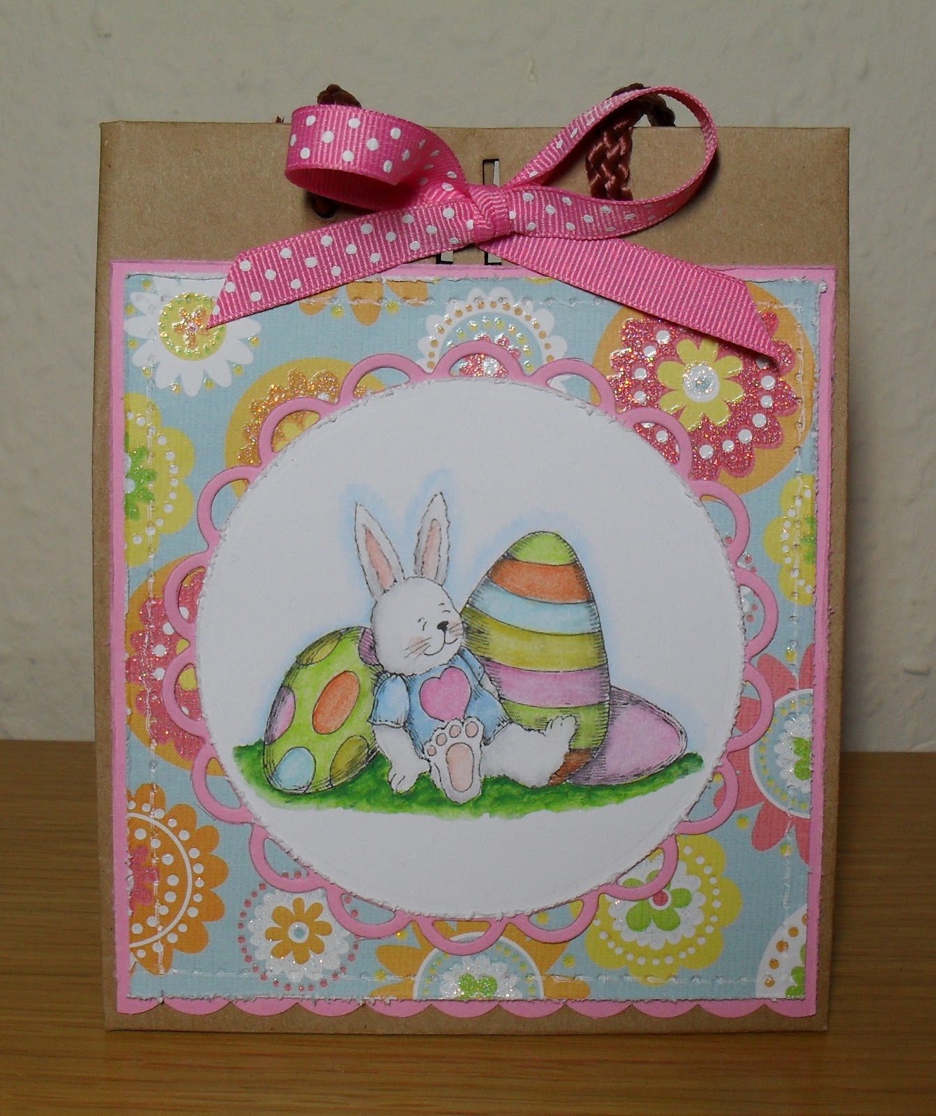 I've used an image from DigiDarla Designs called 'Baby Bunny with Eggs' on my project...another Easter treat bag. The paper is from the 'Hippity Hoppity' pad by We R Memory Keepers...I added some faux stitching using my CutterBee Bug and a white gel pen. I used my EK Success 'Scalloped Diamonds' punch for the border along the bottom, and the spotty ribbon is from Fantastic Ribbons.