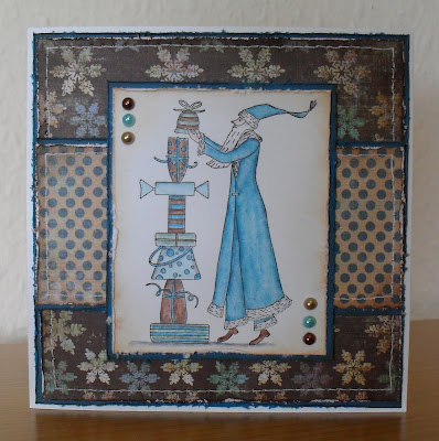 I've used a 'vintagey' looking Santa stamp by Stamps Happen (sorry, it doesn't have a name on it), which I watercoloured to match the 'Festive Frost' papers by Mind's Eye. I distressed all of the edges with inks, and my distressing tool, before adding some faux stitching to the papers using my CutterBee Bug and a white gel pen. The adhesive pearls are from Wild Orchid Crafts.