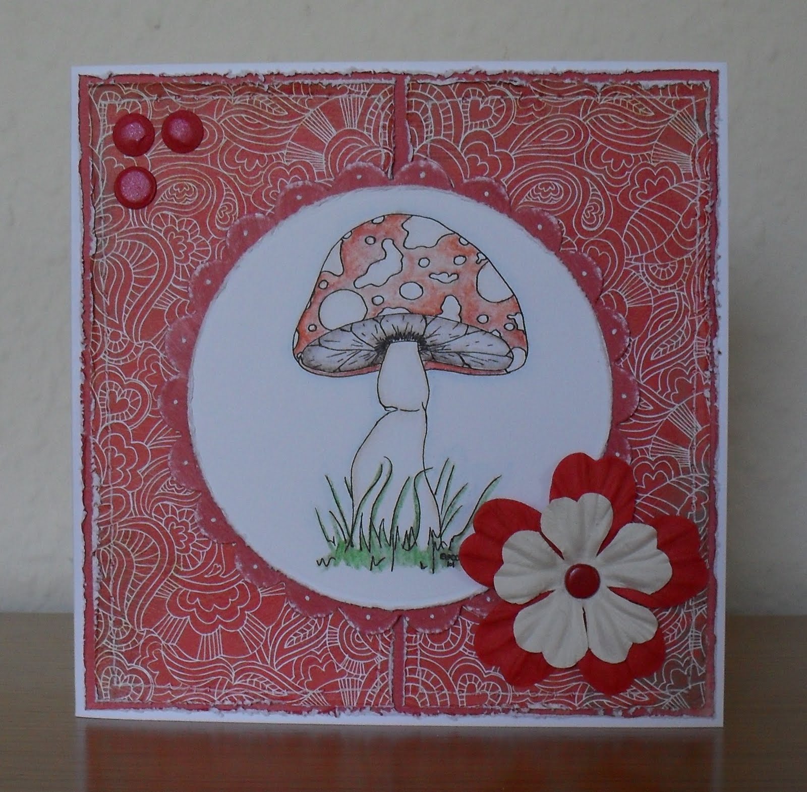 I've used a cute toadstool image...perfect for the 'Red' theme!...and combined it with this gorgeous paper (from the 'Cupcakes' pad by BasicGrey)...it's so lovely, I didn't want to cover it up...so I just added a simple layered flower, and a few pieces of card candy. I used my distressing tool around all of the edges, and added some faux stitching with my Cutter Bee Bug and a white gel pen.